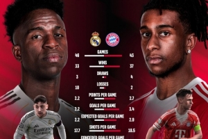 体育资讯4月7日讯 北京时间明天凌晨,拜仁将在欧冠1/4决赛首回合比赛中客场对阵皇马,拜仁官方更新社媒动态,晒出了两队本赛季的数据。