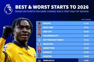 体育资讯3月27日讯 德国转会市场统计了2026年英超球队的场均积分,并与球队上半赛季的场均积分比较,列出英超球队场均积分变化排名,狼队+1.01分居首,热刺-1分垫底。