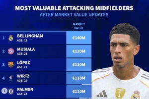 体育资讯4月11日讯 《转会市场》统计了前腰位置球员身价情况,贝林厄姆力压穆西亚拉居首。