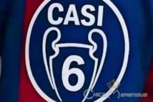 龙赛罗社媒晒图,一件红蓝球衣的欧冠臂章上标注数字“6”,但是上方写着西语单词“CASI(差点)”。