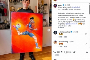佩德里西班牙队首秀5周年获赠个人画作,社媒晒照致谢