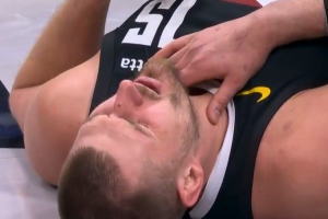 GIF-约基奇脖子位置被凯尔登无意打到